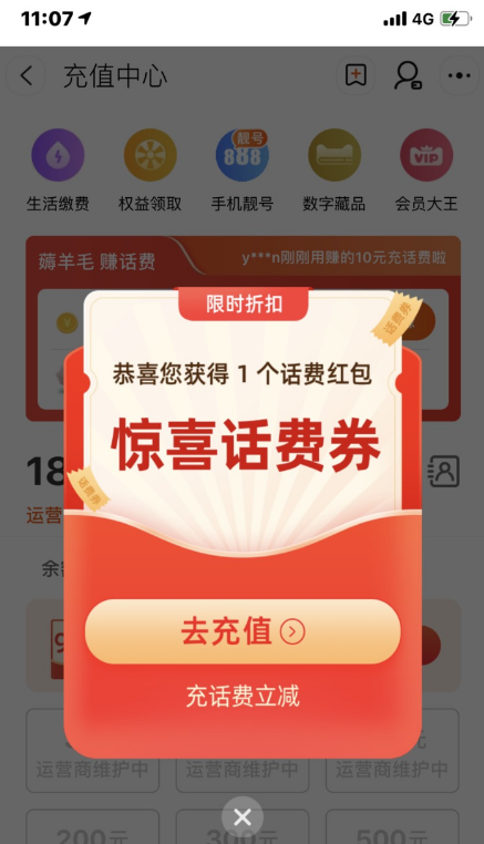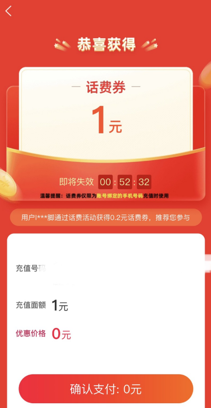 【活动规则】只要打开淘宝APP在首页点击(充值中心)进去,如果进去有弹窗提示获得话费券就可以参加,然后就可以进去充值页面,0元充值1、2元手机话费,这个活动只能电信、联通号码充值,而且只有部分淘宝账号才会有弹窗,如果没有弹窗就参加不了。