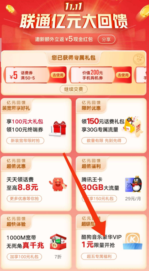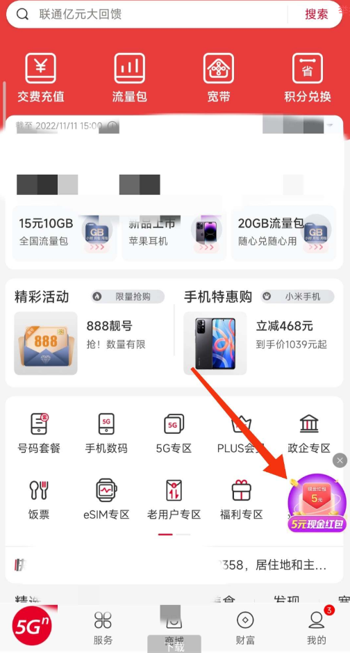 【参与方式】打开中国联通,点右下角,五元现金红包