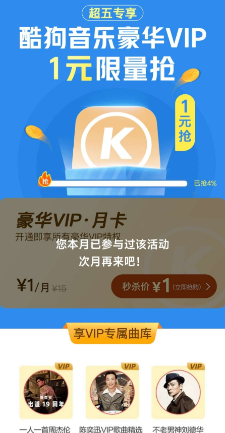 首页 > 活动线报 > 酷狗VIP,1元限量抢