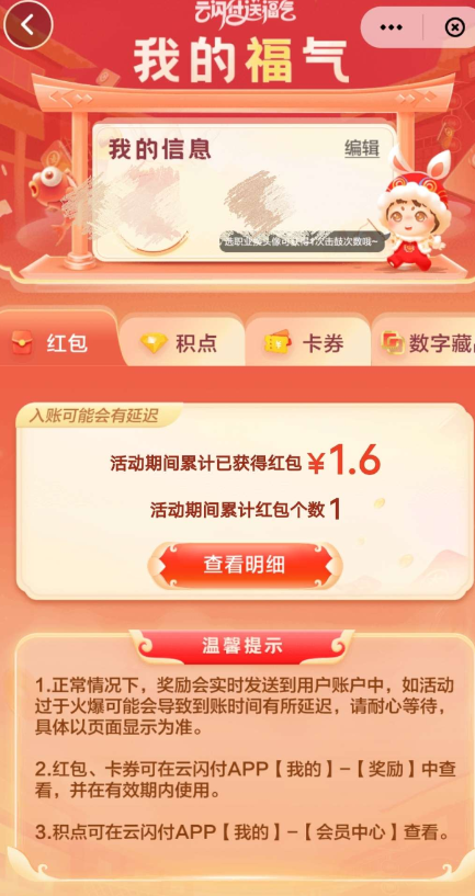 首页 > 活动线报 > 亲测6.2元 云闪付送福气抽0.2-2023元红包