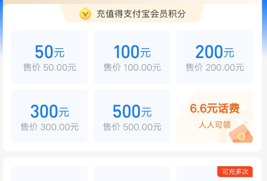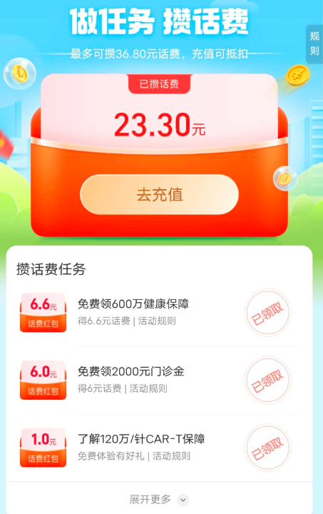 【参与方式】支付宝APP-充值中心-【6.6元话费人人可领】-做一下保障任务领取话费红包,返回充值中心去充值10元话费自动抵扣红包