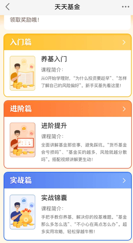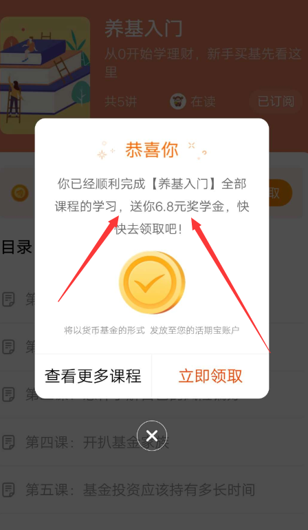 【参与方式】天天基金搜——基金学堂-课程进去-3个板块都点进去看看-有6.8元红包奖励的在玩——折扣卷的奖励就可以无视了,把红包的奖励领了就行——