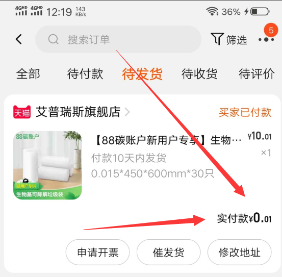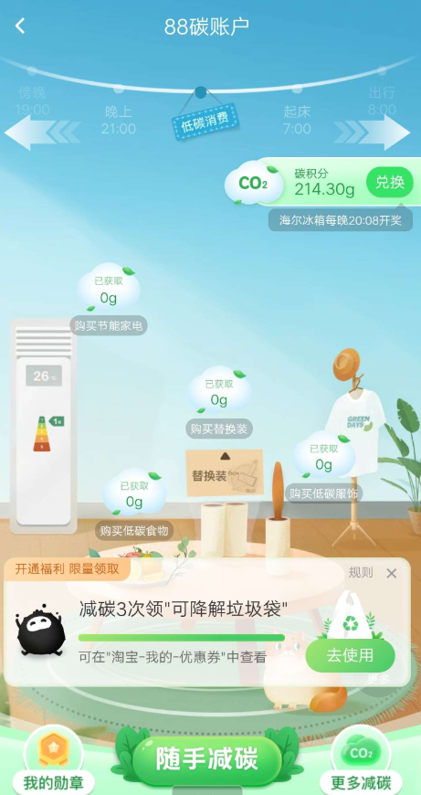 【参与方式】淘宝app-我的-会员中心-88碳账户-进去随手减碳完成3次任务就行-任务简单-等审核过了直接去买就行——0.01撸,实用