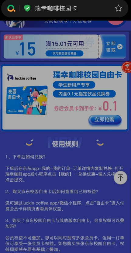 打开地址->根据提示认证学生身份->领15元券0.1元买自由卡,卡内包含0.1元生椰拿铁兑换券
