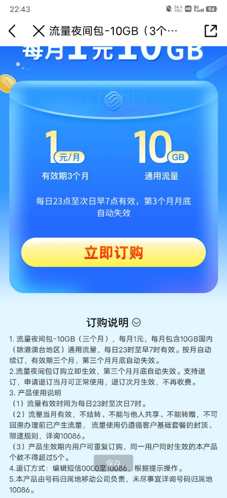 中国移动1元10G 夜间包