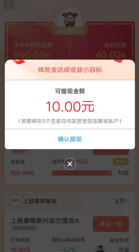 【参与方式】天天基金app-首页搜索基金体验-每日学理财领理财芝士——每100理财芝士体验一个新基金,收益满10可提现