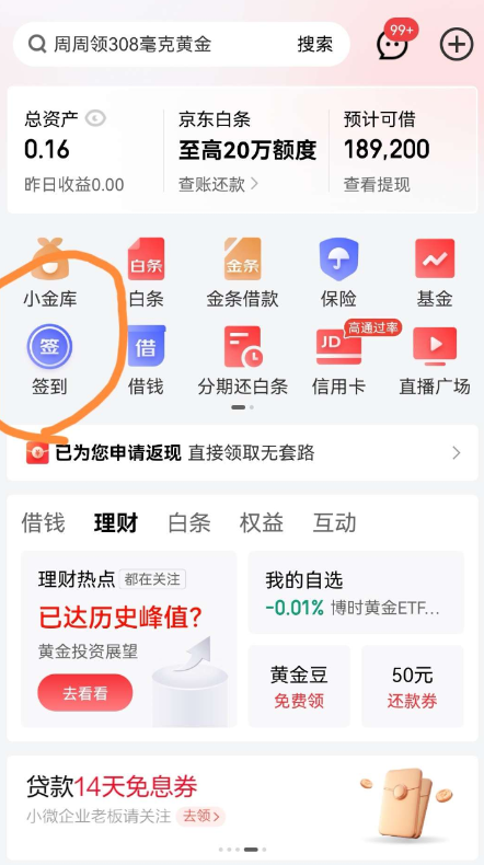 京东金融APP 首页-签到-下拉有个领30金贴的 去完成开户