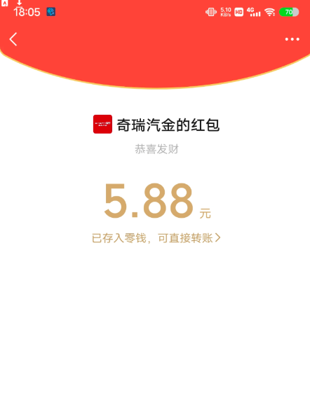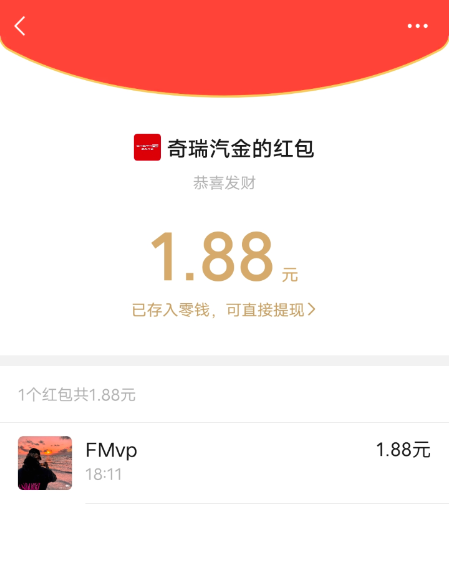 微信关注 奇瑞汽金 公众号领1.88-18.8红包