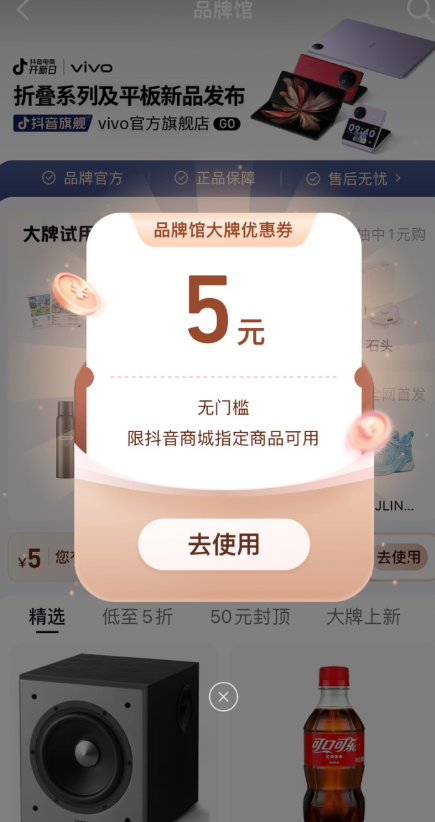 【参与方式】抖音APP顶部“购物”->品牌馆->点击小横幅领5元无门槛券->可以买各大品牌旗舰店的东西