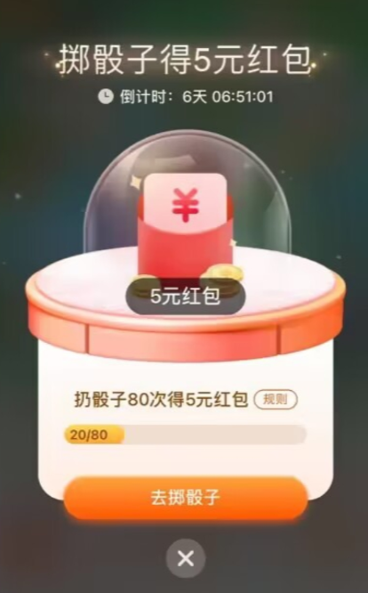 【参与方式】淘宝APP搜索“淘宝人生”->点击“去逛街”->左侧“限时奖励”->简单浏览得骰子并扔出,大概4天就能满80次,领5元通用购物红包