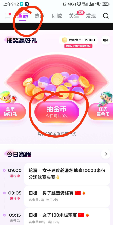 打开快手或极速版,左上角亚运,下拉抽奖