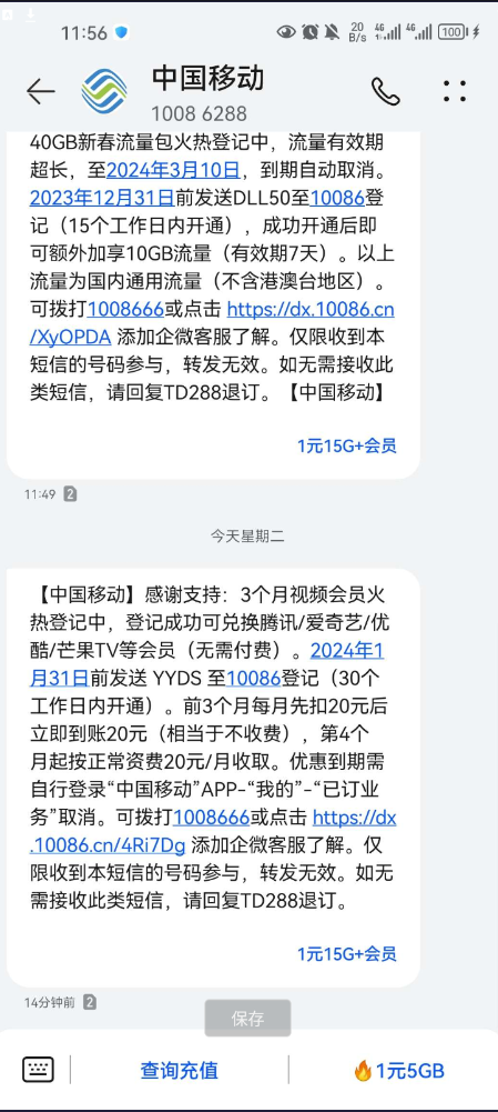 【中国移动】感谢支持:3个月视频会员火热登记中,登记成功可兑换腾讯/爱奇艺/优酷/芒果TV等会员(无需付费)。2024年1月31日前发送 YYDS 至10086登记(30个工作日内开通)。前3个月每月先扣20元后立即到账20元(相当于不收费),第4个月起按正常资费20元/月收取。优惠到期需自行登录“中国移动”APP-“我的”-“已订业务”取消。可拨打1008666或点击 https://dx.10086.cn/4Ri7Dg 添加企微客服了解。