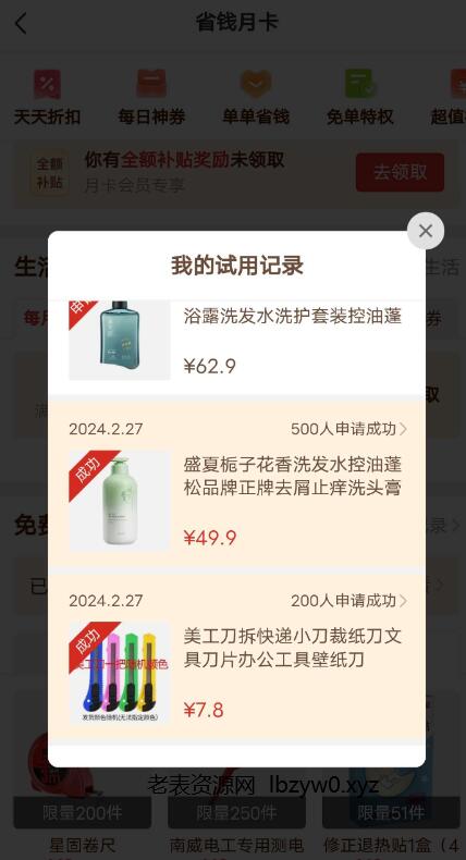 【参与方式】打开并夕夕-个人中心-省钱月卡-然后会弹出来让你0.1或0.3开通月卡,开好后打开省钱月卡-免费试用,每天可以选择两个东西,建议选择几百件的东西,因为一百个或者几十个的东西很难抢到,领取后点击浏览店铺30秒(5次),把成功率弄到100就可以了,建议每隔几小时去看一下。