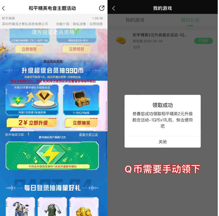 跳转到QQ音乐APP->绿钻用户2亓升级超级会员,每次可抽1~99Q币,最多升12次抽12次 活动地址:https://y.qq.com/forest/ia6guHL95UrH0-gG/index.html