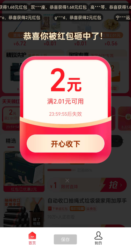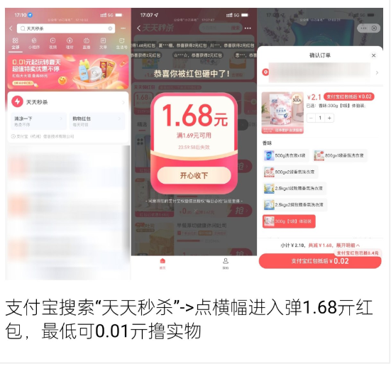 【活动介绍】支付宝搜索“天天秒杀”->点横幅进入弹1.68亓红包,最低可0.01亓撸实物