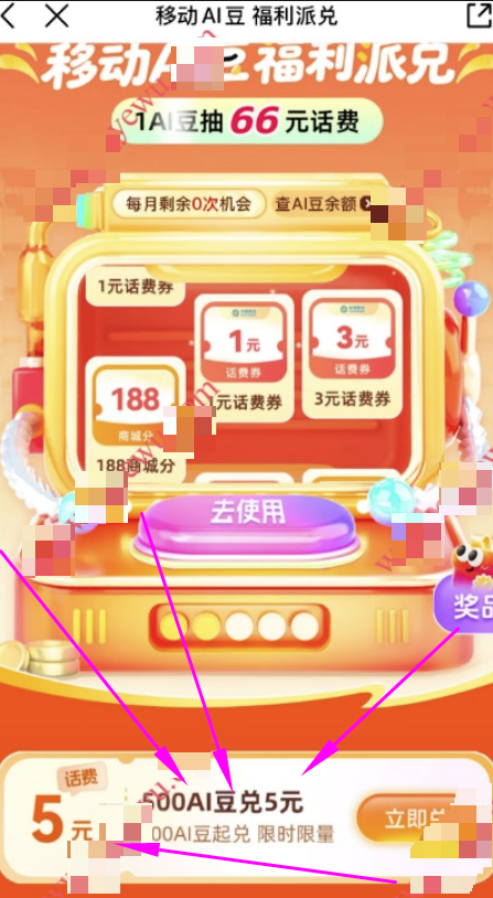 和包AI豆福利派兑抽0.1-66元话费券+兑5元话费