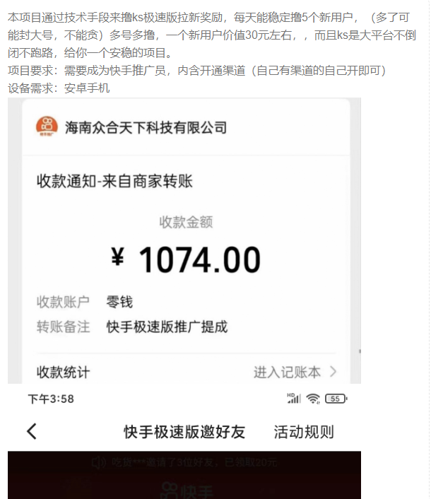 【高端精品】最新快手极速版偷撸接码无限拉新项目,一个人头30块。多号多撸