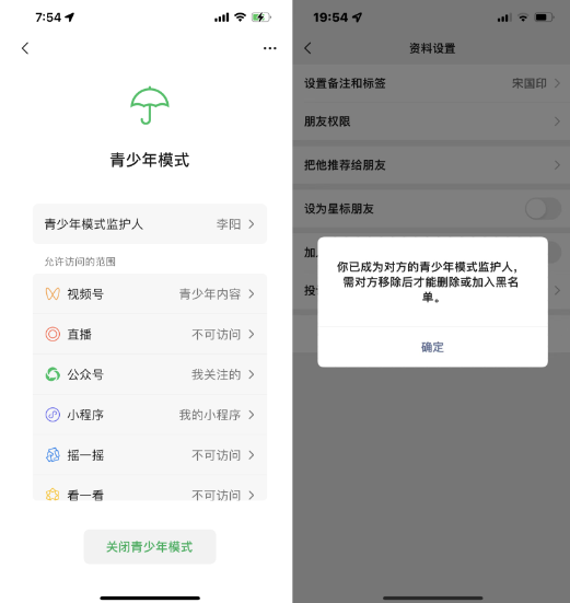 3、在你自己微信青年模式哪里会显示对方微信昵称表示成功了,对方就没办法删除你和加入黑名单必须要你把他移除青少年模式监护人才行,这不就轻松拿捏了吗,你也可以关闭监护人模式,不会影响效果