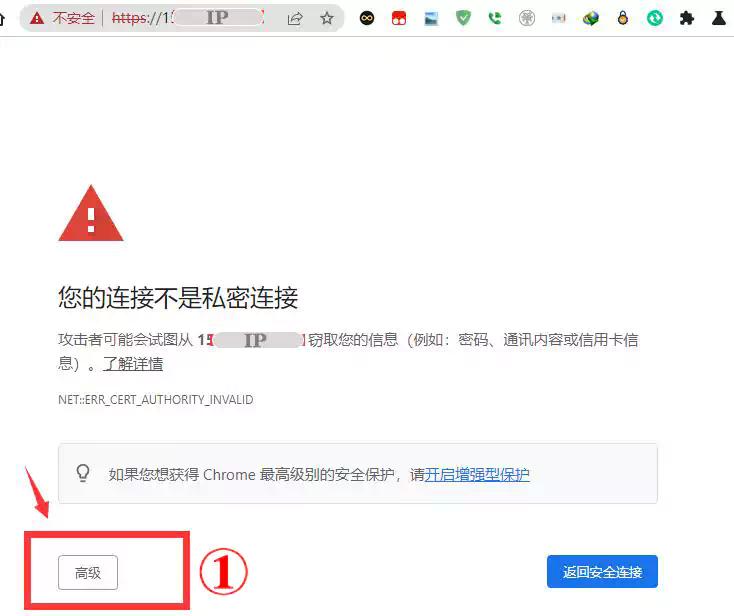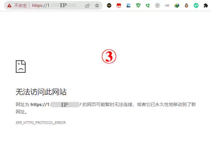 此时通过https://IP,访问网站,会出现“您的连接不是私密连接”,然后点高级,会出现“继续前往IP”,然后会出现“ERR_HTTP2_PROTOCOL_ERROR”错误,无法访问此网站提示!