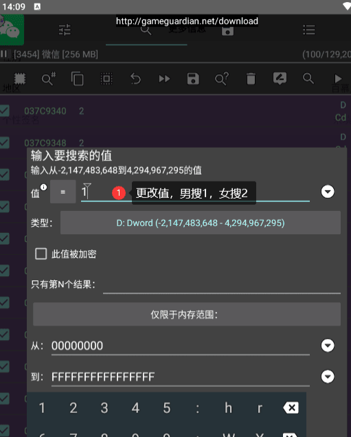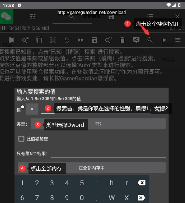 3. 然后根据图中步骤设置点击搜索,看你选择的性别是什么,男就搜1,女就搜2,我上面是选的女,值填2,搜索