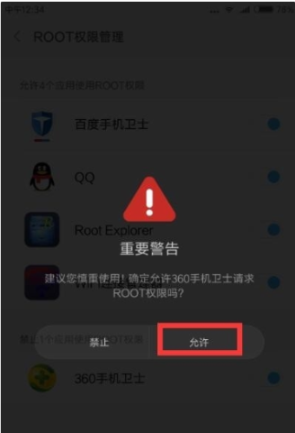 3.选择您不需要的手机软件点击卸载,360会弹出一个警告提示框,要求获取root权限,选择“允许”即可。获取权限后就可以删除手机自带软件了。