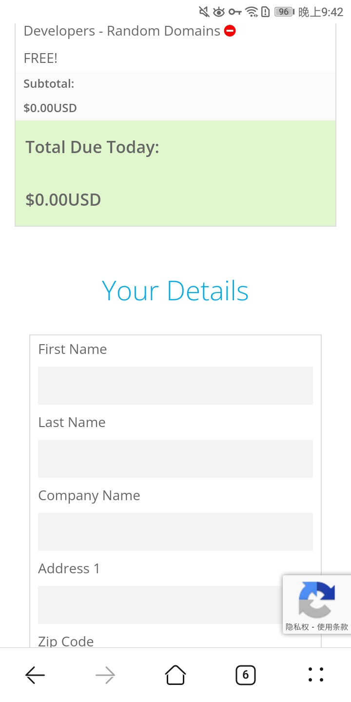 5.进去以后发现啥都没有(图一),再按照第二步操作,就会有一个信息表单要你填,这个时候就要用到一个特别重要的网站[滑稽]:美国个人信息生成网[滑稽](百度即可)。将临时信息的内容填写到freenom(要一一对应哦[哈哈])(邮箱不改)。然后在最后两个编辑框内输入密码。勾选下方的选择框,在点击蓝色按钮。即可注册成功。(图五和图六)