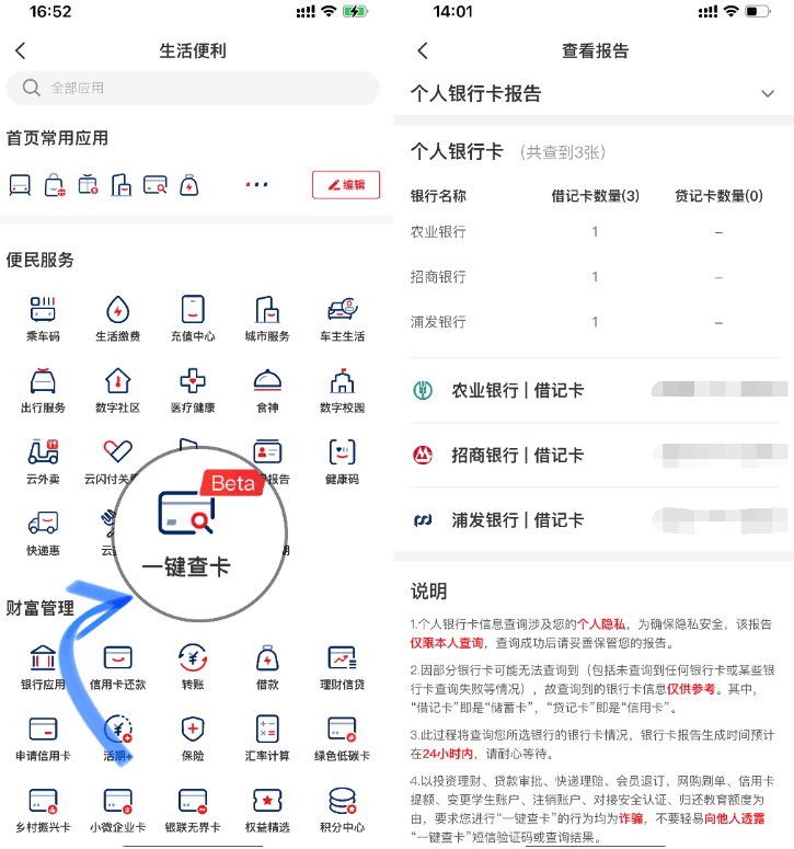 下载云闪付APP后,登录找到“一键查卡”服务栏目点击进入,选择当次查询的商业银行范围(建议直接全选所有银行)