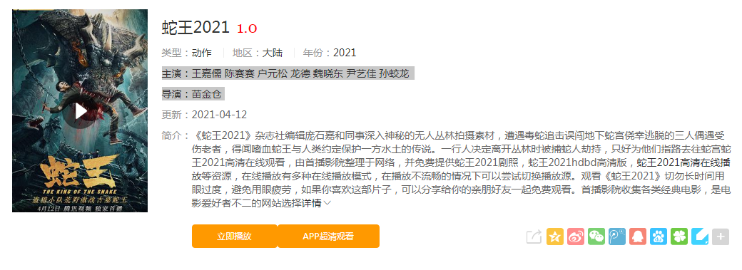 《蛇王2021》在线观看-主演:王嘉儒 陈赛赛 户元松 龙德 魏晓东 尹艺佳 孙蛟龙 导演:苗金仓