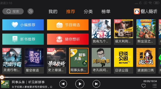 【资源介绍】:懒人畅听车载版,汽车上最领先的听书平台,涵盖了小说、评书、名著、戏曲等内容,解放你的双眼与双手,用耳朵畅听这个美丽精彩的世界。