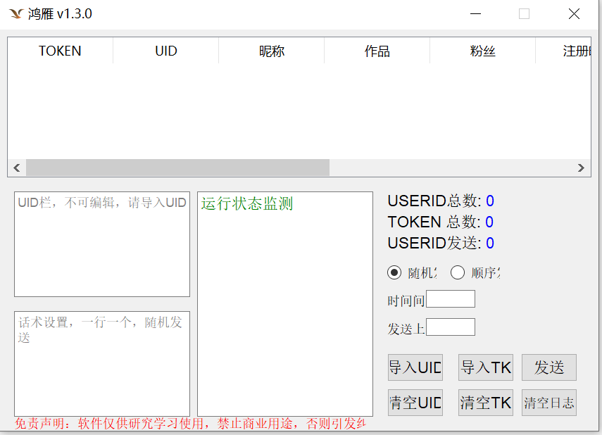 2.进入软件后,导入tk、导入UID、设置话术、设置发送间隔和发送次数。