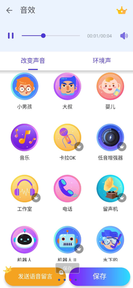 多种变声效果可选:小萝莉,御姐音,幽灵,机器人……只需轻轻一点,就可以给声音叠加有趣的音效
