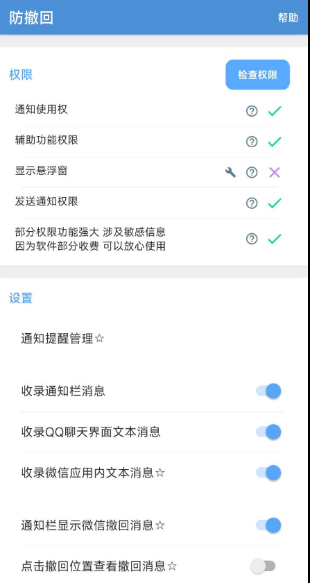 防撤回神器APP(Anti-recall)是一款收费的Android免root查看撤回消息和闪照的辅助工具,支持微信/QQ/TIM防撤回,其它功能包括了:无限查看QQ/TIM图片闪照,消息防止复读,微信语言助手,自定义通知管理等等。