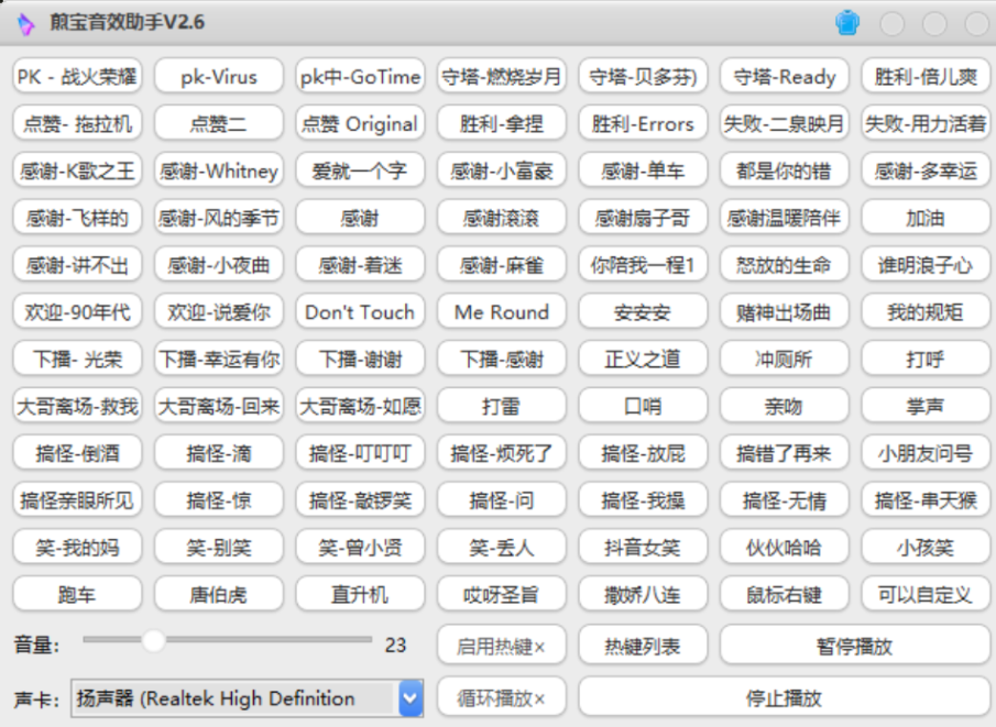 主播直播音效助手, 设置了pk中、pk守塔、pk失败、pk胜利、pk拉票、点赞、欢迎用户、感谢礼物、大哥离场、大哥回来、聊天背景音乐、下播音乐、搞怪音效、主播常用音效。 另外右键可以自定义音效,可以设置快捷键。 可以选择输出通道。软件永久免费。