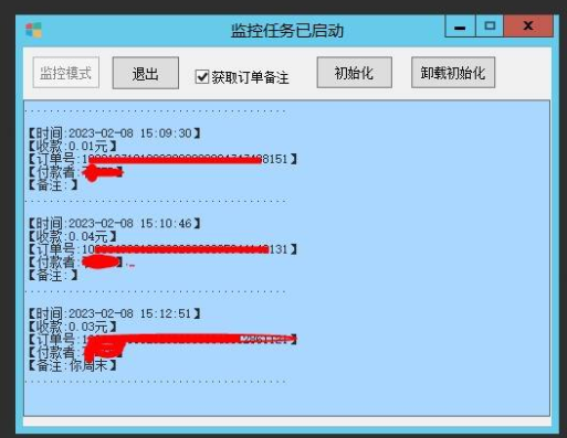 一直想做个vx的订单监控, 前端时间正好接了个类似需求的小定制, 就深入的研究了下 直接监控pcvx的收款小账本, 返回:订单时间,备注,付款人,金额 放服务器测试了一周,稳~~ 使用前,先打开pcVX里的收款小账本,初始化,开启监控。 tip:软件会自动创建data文件夹用来存放订单记录,放服务器时可能会创建目录失败,手工创建一个就行了