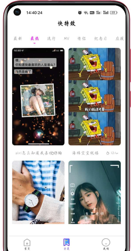 一键替换静态图片,自动生成专属特效短视频。在制作过程中,可以修改图片滤镜的效果,添加背景音效,制作完成后可以与所有热门短视频平台共享。