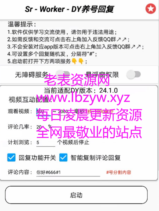抖音养号回复小助手,新增了复制评论区功能,评论区的内容随机复制一条发送,增加真实性,完全拟人化,有需要的话也可以自己设置多条话术,会随机抽取发送其中一条,更加智能方便,实现全自动养号。如需反馈交流可以左上角加入qq反馈群交流与反馈问题