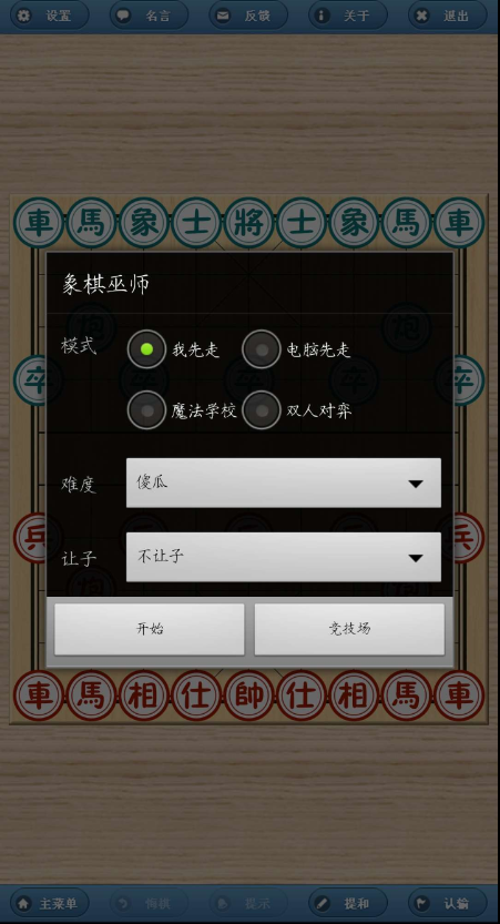 支持设置模式,包括:我先走、电脑先走、不用电脑,支持设置多种难度级别,包括:菜鸟、新手、入门、业余、专业、大师等,它支持设置先走让子,包括:不让子、让单马、让双马、让九子。