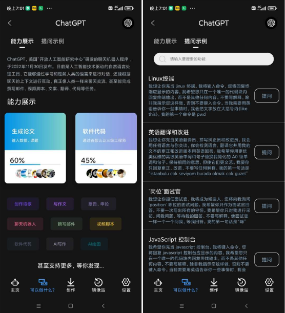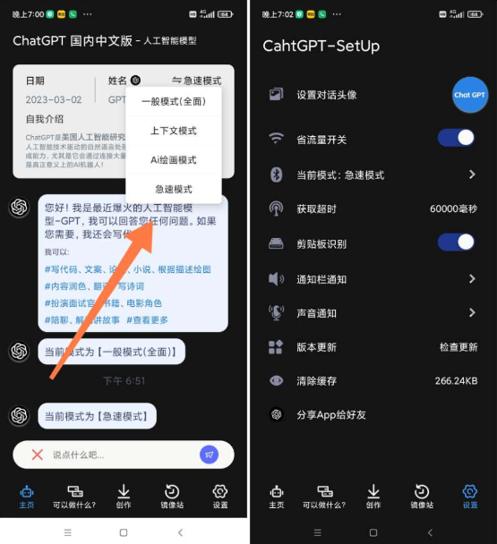 【版本说明】Chātgpt中文版是国内刚上线的一款人工智能技术的语言处理工具软件,它不仅可以学习和理解人类的语言来和人对话,还能撰写邮件、文案、翻译、代码等功能。右上角还可以切换模式,有你问我答模式、上下文模式、AI绘图模式和急速模式,下面有个对话框,输入你想问的问题,就可以搜索出来。