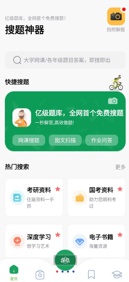 搜题神器是一款免费搜题工具,支持拍照搜题和文本搜题,支持查看热门网课答案,还能搜索各种学习资料,例如考研、国考、深度学习、电子书籍、教程、电影等资源。