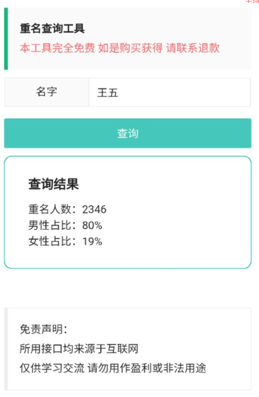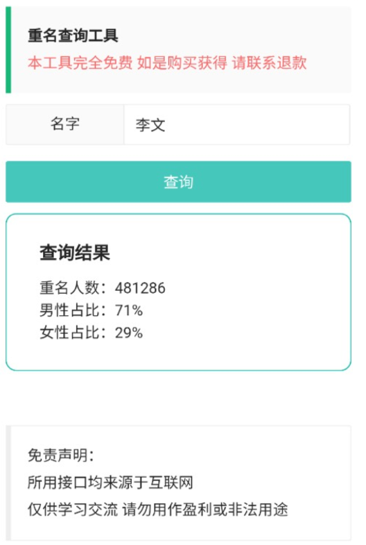 首页 > 软件仓库 > 输入名字一键查询全国重名人数