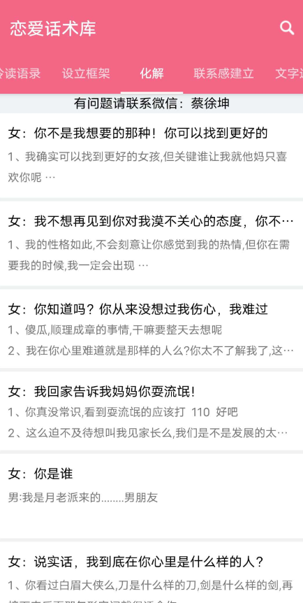 恋爱话术库,一款可以帮你解决以上烦恼的App,海量话术,遇到不知道怎么回复女生时,来这里搜一下,N+精彩回复供您选择,让您和女生聊天不再烦恼,更有问答社区和网友们共同交流。