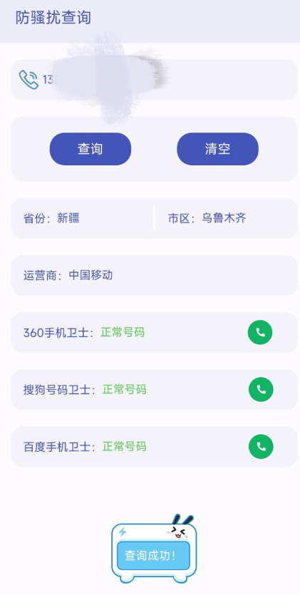 一键查询号码是否为骚扰号码 • 可检测正常号码骚扰号码诈骗号码