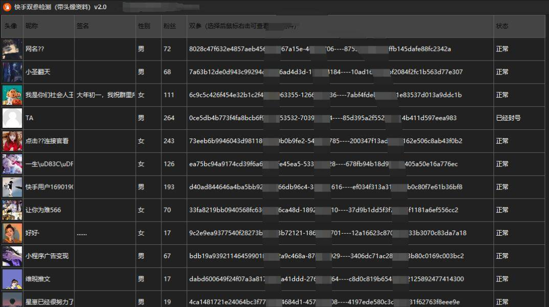 快手双参检测2.0(查头像、昵称、签名、粉丝量、性别、背