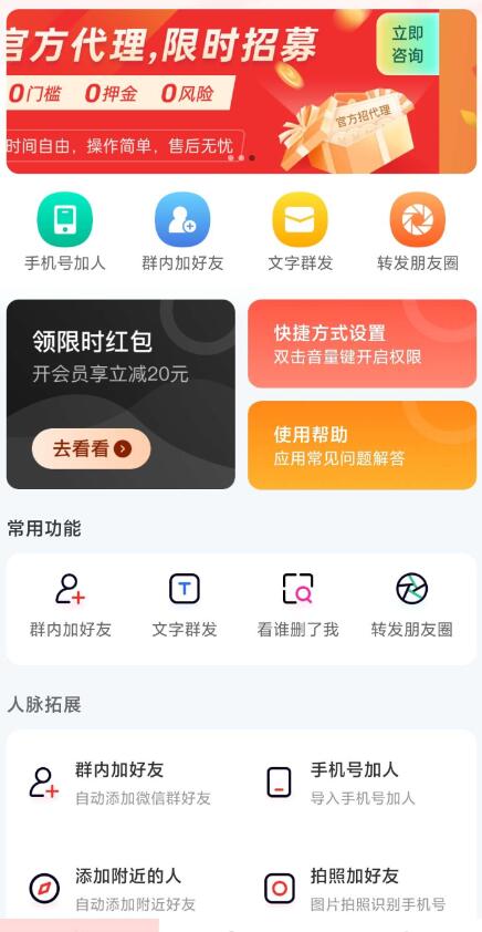 【软件简介】发的获取客源的手机APP,有清理僵尸粉、群发消息、一键转发朋友圈等功能,支持官方微信,全新适配微信分身,每天都有微信群资源更新