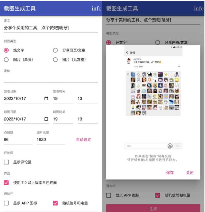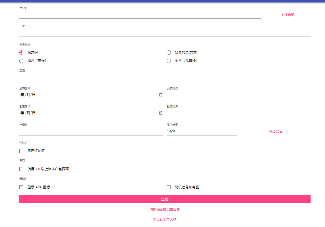 朋友圈转发截图生成工具是一款免费模拟微信朋友圈的在线工具,可用于个人应付各类强制要求转发朋友圈的情形、微信朋友圈集赞等等,能够自定义用户名、朋友圈内容、发布时间、点赞数量、评论区内容、手机电量信息等等,即开即用。