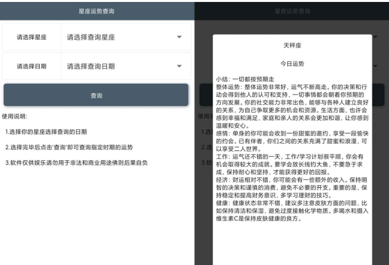 软件名称:星座运势查询 软件版本:1.0.0 软件语言:中文 软件大小:1.91MB 支持系统:Android 4.4+及更高版本