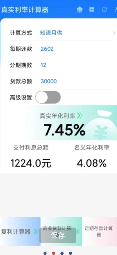 具有计算贷款真实利率、存款利率、常见银行产品真实利率分析等功能,十分强大