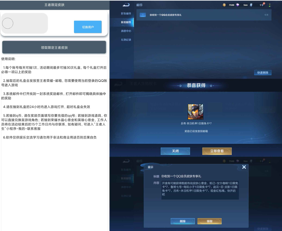 软件名称:王者限定皮肤 软件版本:3.00 软件语言:中文 软件大小:3MB 支持系统:Android 4.4+及更高版本