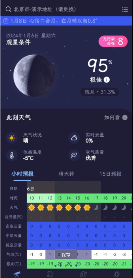 app完全免费,原版有广告,天文通作为专业的观星辅助工具,提供一站式天文服务。能够根据晴天钟与其他ECMWF气象来查看观星指数