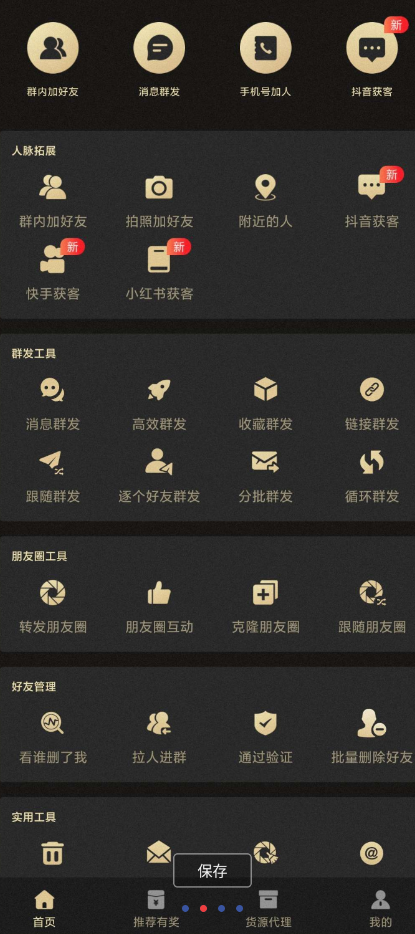 【应用简介】这是一款拥有众多功能的微商工具,为用户提供了海量高效实用的功能,包括人脉扩展、常用工具、点赞发圈、精选功能等多个分类,用户可以非常轻松的添加好友,以及群发消息。此外,该软件还推出了货源代理的服务,提供服装、美妆、鞋靴、箱包、表业等多个分类商品,用户可以选择品类和品牌来代理产品,无需担心没有货源的问题。